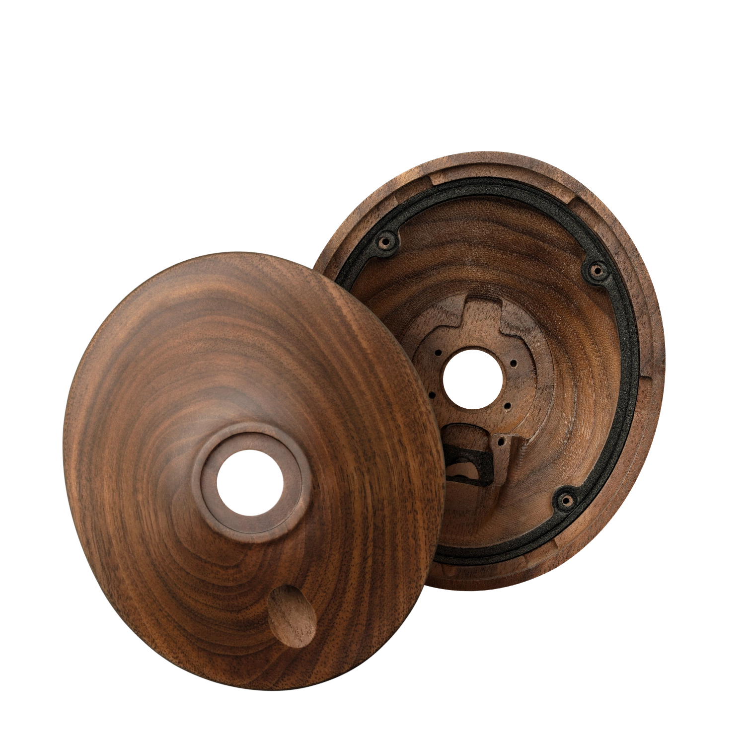 Treasured for its rich, dark color and beautiful grain, walnut wood is strong and durable, yet lightweight and malleable. The cups are CNC-machined, then hand-finished, stained, and polished.