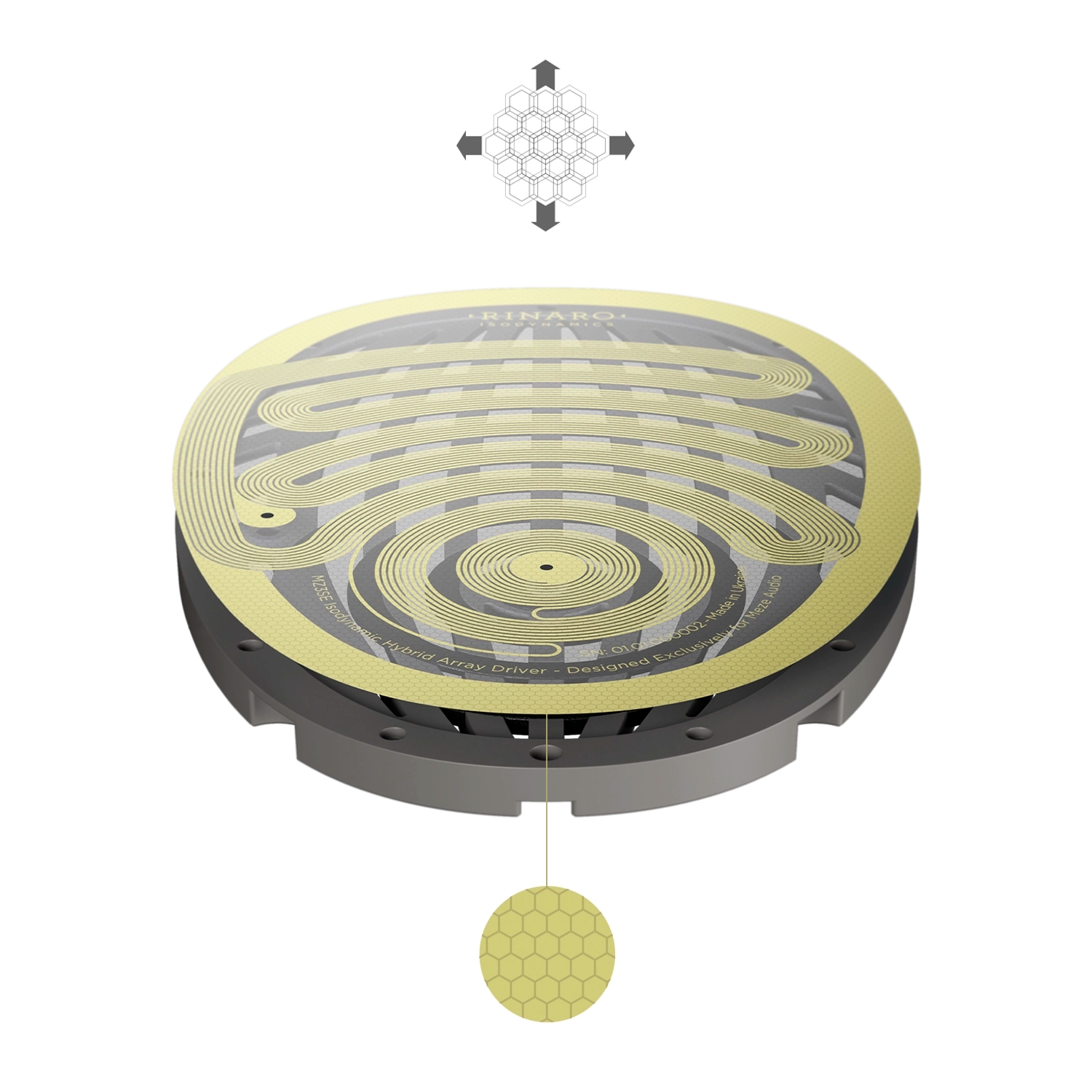 Symmetrically placed on either side of the diaphragm, neodymium magnets are arranged into a Hybrid Array to create a 0.35 Tesla Isodynamic magnetic field required for a uniform activation across the whole diaphragm surface.