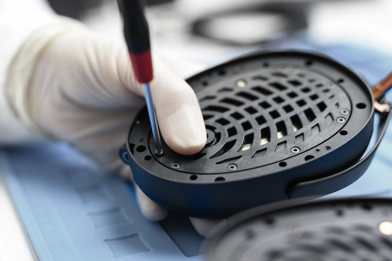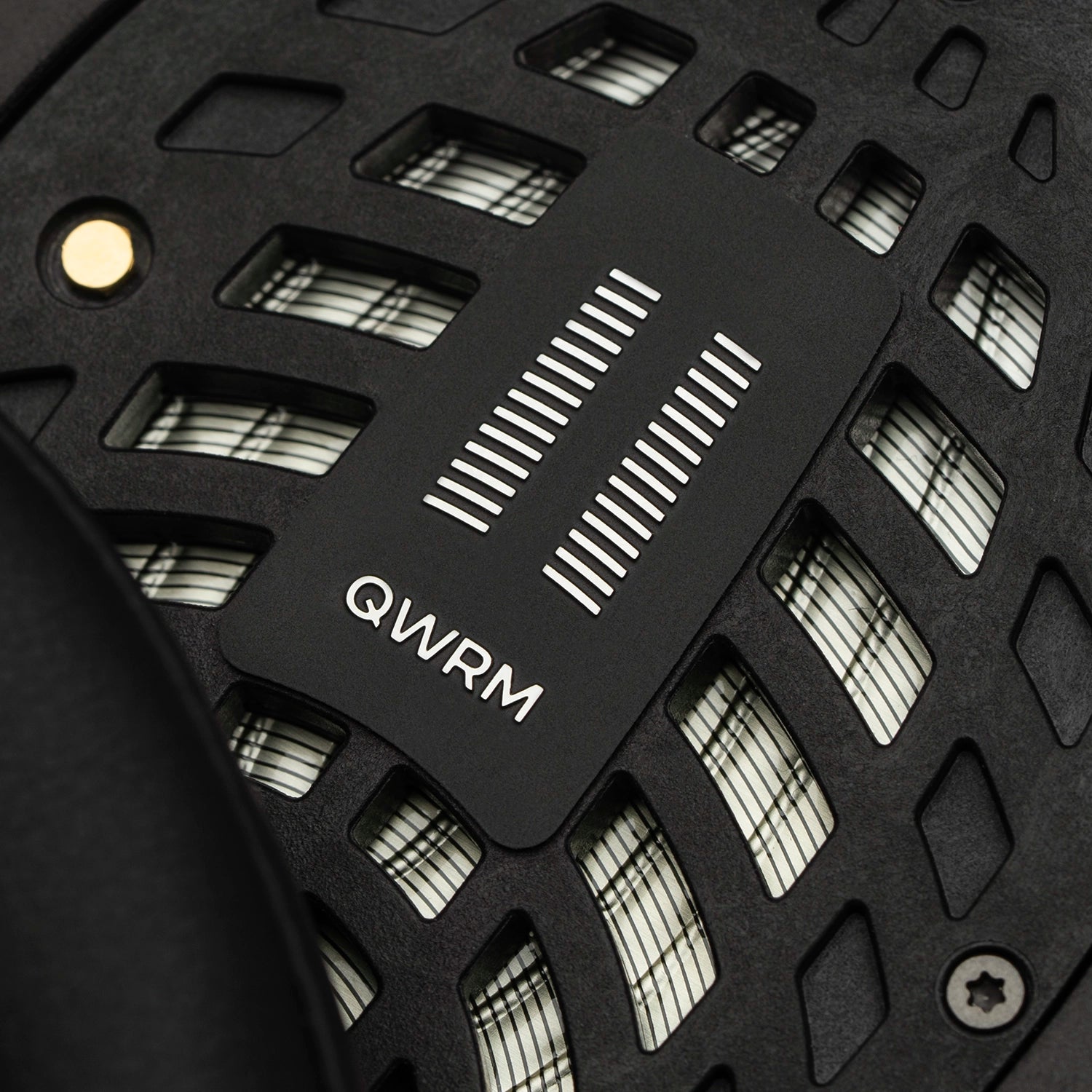The Quarter Wavelength Resonator Mask is a precision-crafted metal component that strategically covers select openings in the driver frame, to effectively attenuate high-frequency peaks above 7 kHz for a less fatiguing listening experience.