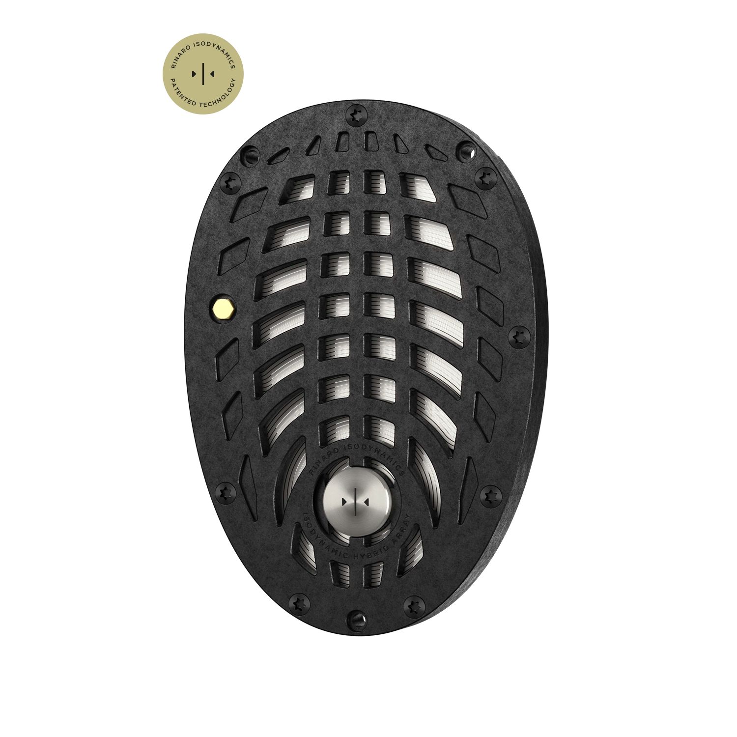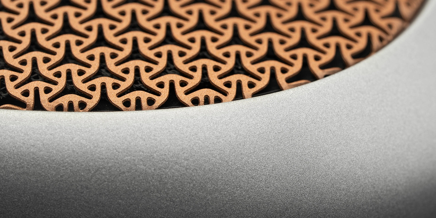 Our implementation of the Acoustic Metamaterial Tuning System technology relies on a precision-crafted metal component that strategically covers select openings in the driver frame, to effectively attenuate high-frequency peaks for a less fatiguing listening experience.